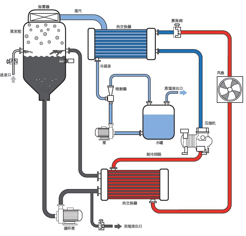 本設備為全自動(dòng),原水桶到中液位后,蒸發(fā)器自動(dòng)進(jìn)水,水泵運行產(chǎn)生真空,壓縮機運行產(chǎn)生熱量給蒸發(fā)罐內廢水加熱,在真空狀態(tài)下,廢水溫度上升到30℃,廢水開(kāi)始蒸發(fā),預熱完成。
